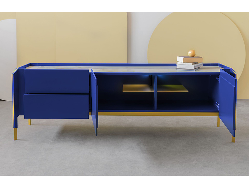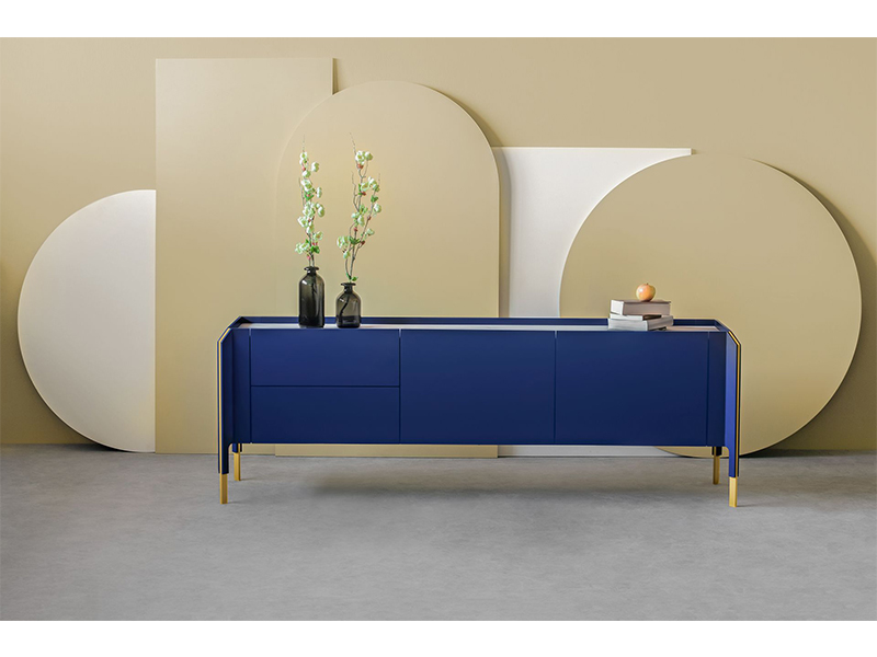 Η απόχρωση του Sapphire blue, αποτελεί μείγμα του μπλε, του γαλαζοπράσινου aquamarine και του μαύρου. Έτσι, μπορούμε να αντιληφθούμε τους λόγους της δυναμικής τους και του αποτελέσματος που χαρίζει, σε συνδυασμό με τα ορείχαλκα μεταλλικά στοιχεία. Αυτό που καθορίζει ως εντυπωσιακό τον μπουφέ LENK, είναι η σύνθεση των πάνελ και των μεταλλικών φύλλων, τα οποία τοποθετημένα το ένα δίπλα στο άλλο δίνουν σχήμα και δομή, τόσο λεπτεπίλεπτη και κομψή, που μοιάζουν με φύλλα χαρτιού.