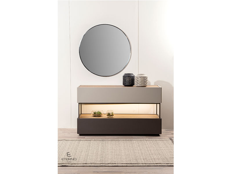 Ξύλο δρυς ρουστίκ σε συνδυασμό με λάκα ματ και μεταλλικά στοιχεία.